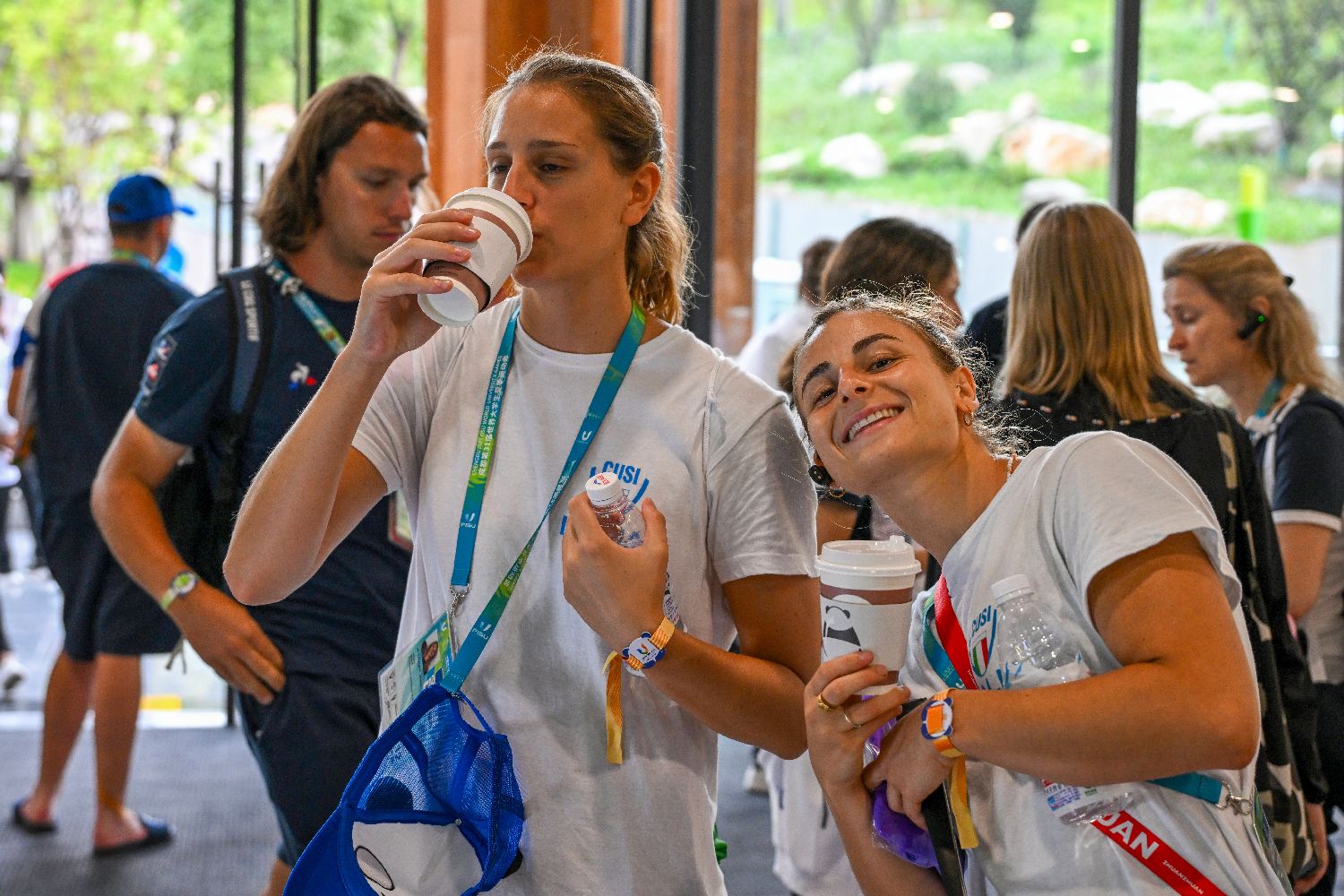 图为来自意大利的运动员品尝“熊猫”咖啡。(图片来源:中新社)