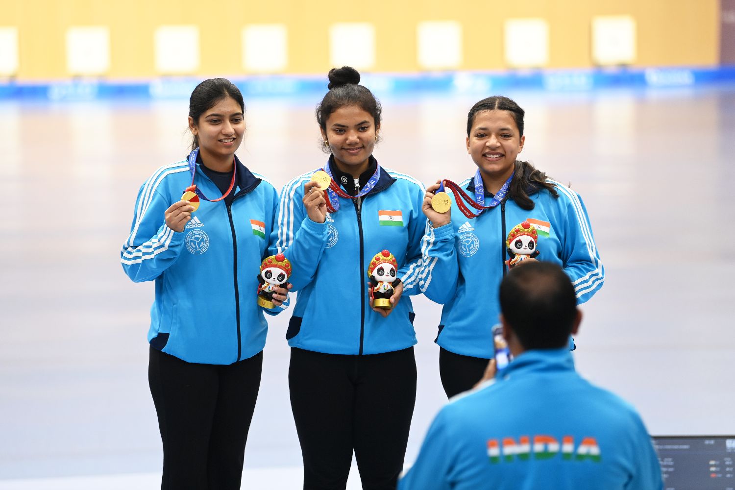 图为印度队SAMRA Sift kaur(右一)、KAUSHIK Manini(右二)、CHOUKSEY Ashi(右三)合影。当日,第31届世界大学生夏季运动会女子50米步枪三种姿势团体决赛在四川成都举行,印度队获金牌。(图片来源:中新社)