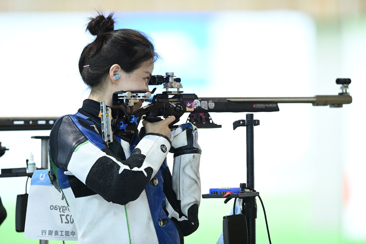 图为中国队选手史梦瑶在进行站姿比赛。当日,第31届世界大学生夏季运动会女子50米步枪三种姿势团体决赛在四川成都举行,中国队获银牌。(图片来源:中新社)
