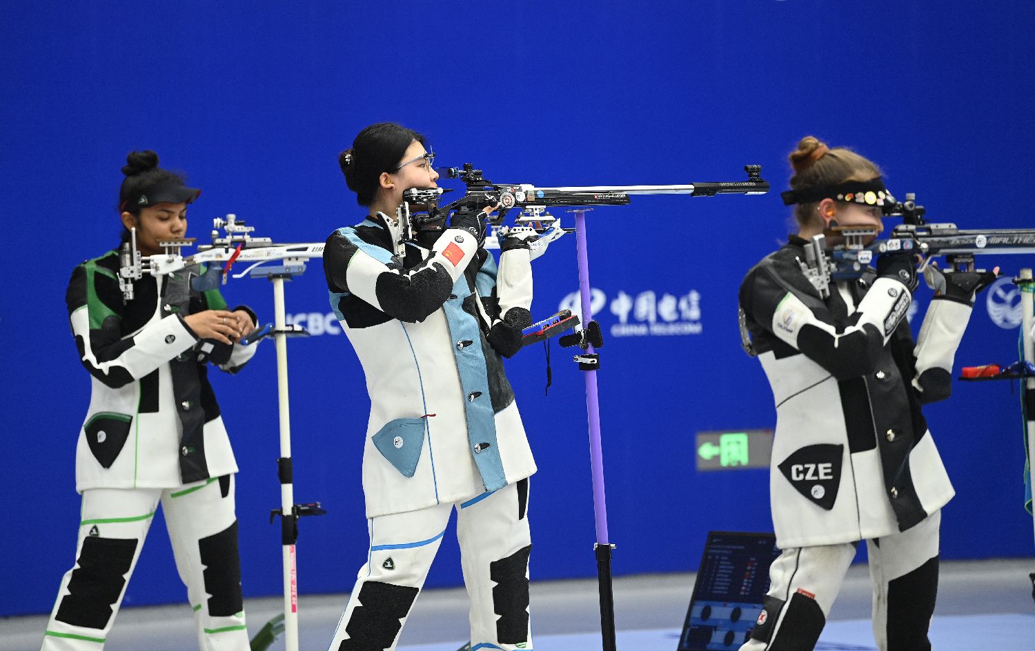 图为当日,第31届世界大学生夏季运动会女子50米步枪三种姿势决赛在四川成都举行,中国选手王泽儒(中)获得铜牌。(图片来源:中新社)