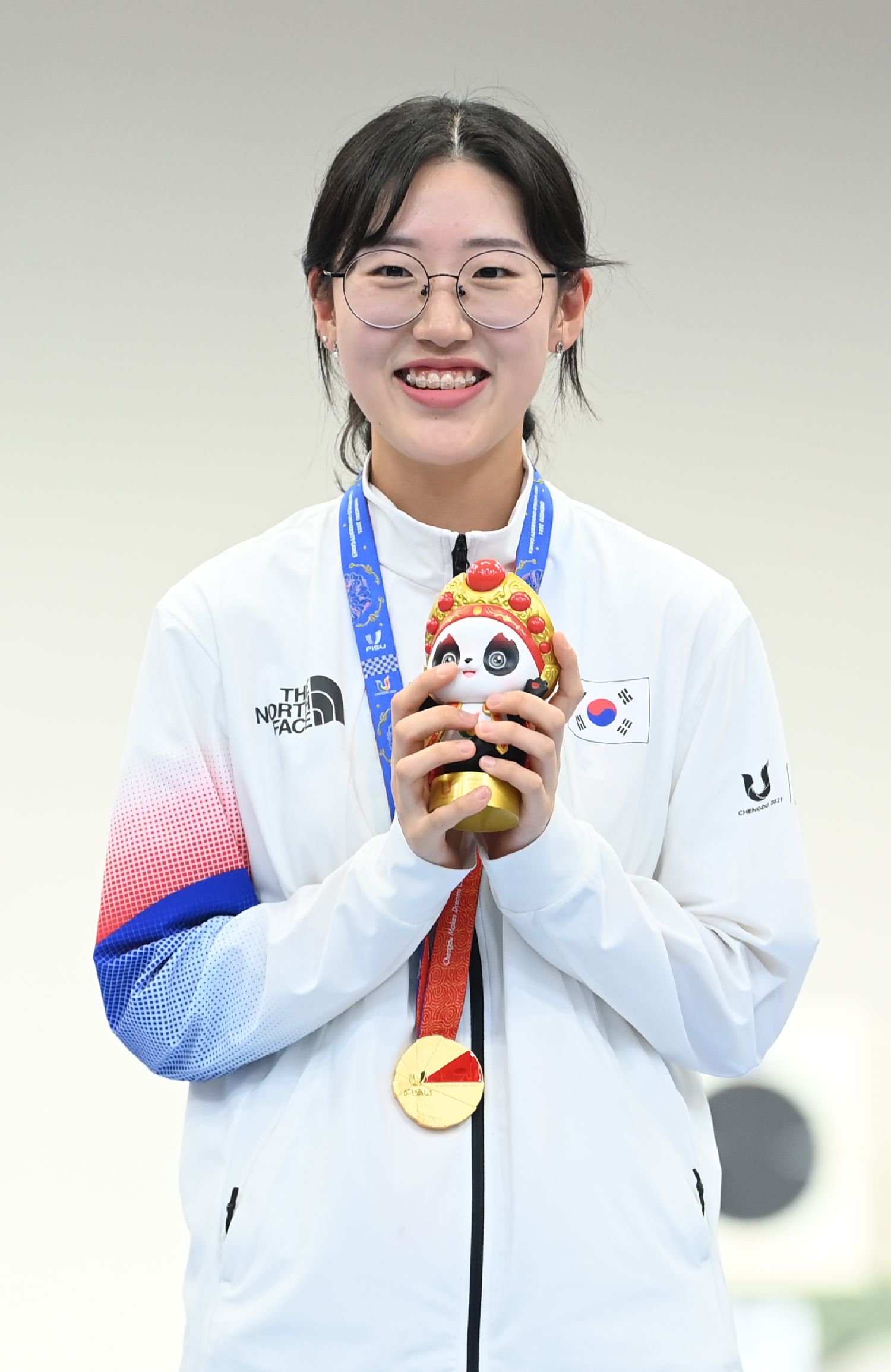 图为当日,第31届世界大学生夏季运动会女子25米手枪决赛在四川成都举行,韩国选手YANG Jiin获得金牌。(图片来源:中新社)