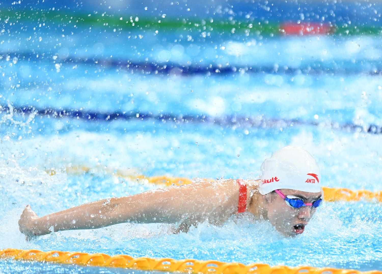 图为张雨霏在比赛中。当日,第31届世界大学生夏季运动会女子50米蝶泳预赛在成都举行,中国运动员张雨霏以25秒83的成绩晋级半决赛。(图片来源:中新社)