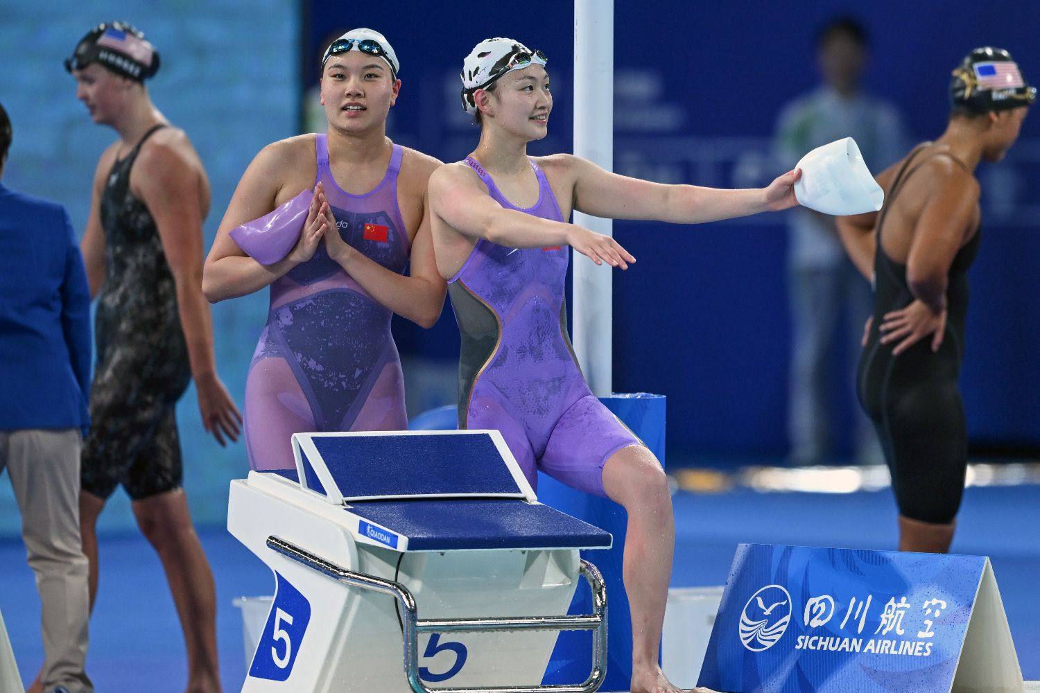 图为中国运动员李冰洁(右二)和柳雅欣(右三)在获胜后庆祝。当日,在成都举行的第31届世界大学生夏季运动会女子4x100米自由泳接力决赛中,中国队以3分37秒51的成绩夺得冠军。(图片来源:新华社)