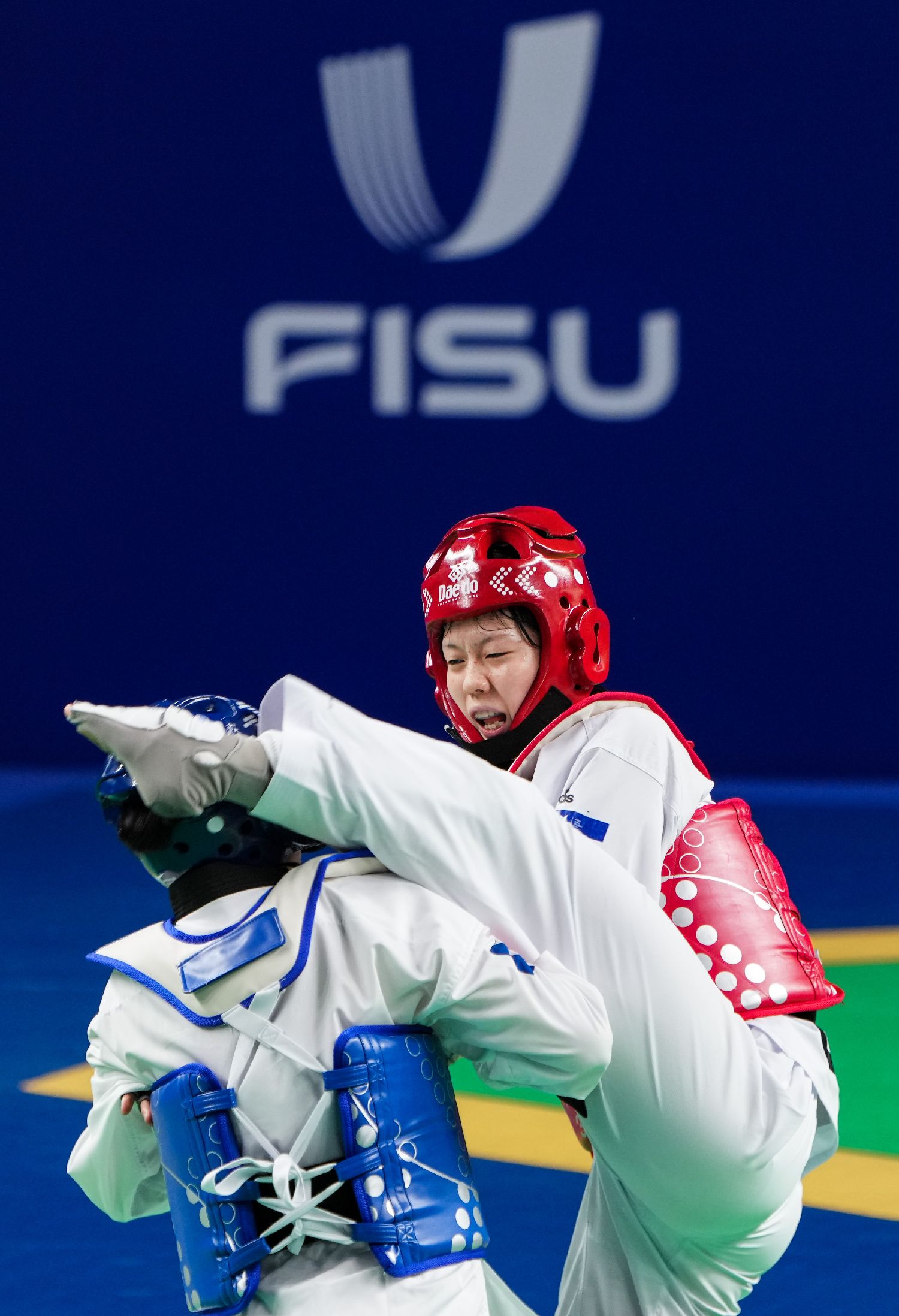 图为中国运动员宋洁(右)与哈达德在比赛中。当日,在成都举行的第31届世界大学生夏季运动会跆拳道女子67kg以下级半决赛中,中国选手宋洁战胜法国选手哈达德,晋级决赛。(图片来源:新华社)