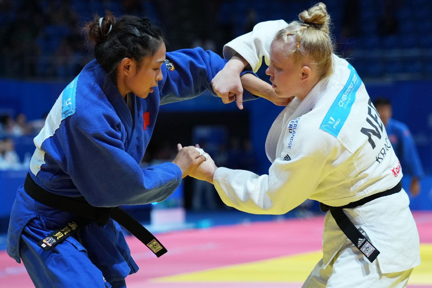 图为中国队选手冯贝贝(左)与荷兰队选手纳迪娅在比赛中。当日,在成都举行的第31届世界大学生夏季运动会柔道女子团体复活赛第一轮比赛中, 中国队以1比3不敌荷兰队,无缘半决赛。(图片来源:新华社)