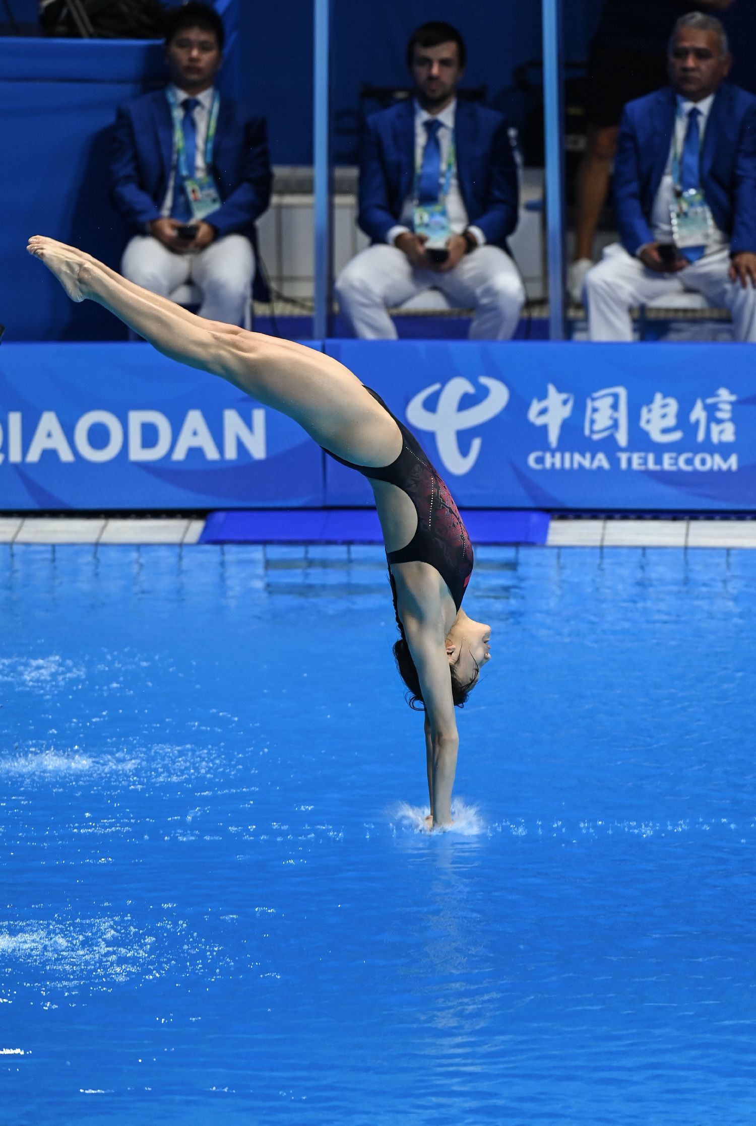 图为中国选手陈佳在比赛中。当日,在成都举行的第31届世界大学生夏季运动会女子1米跳板决赛中,中国选手陈佳以318.90的总分夺得冠军,中国选手王壹以280.35的总分夺得亚军。(图片来源:新华社)