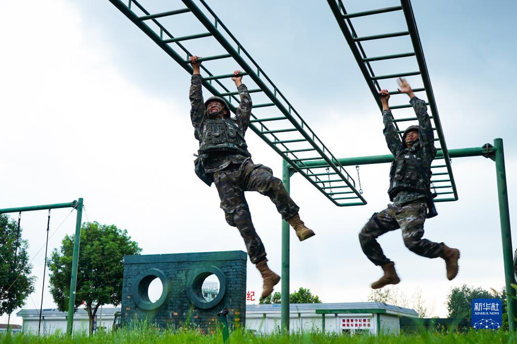 7月31日,武警安徽总队蚌埠支队组织开展300米障碍训练,特战队员快速通过水平悬梯障碍。(图片来源:新华网)