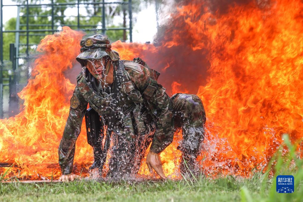 7月30日,陆军第72集团军某旅组织官兵进行极限课目训练,一名战士穿越火障。(图片来源:新华网)