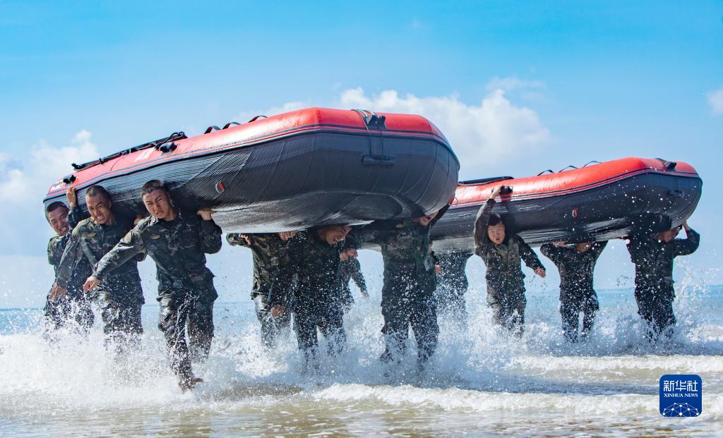 7月31日,武警广西总队防城港支队官兵组织扛舟行进训练。(图片来源:新华网)