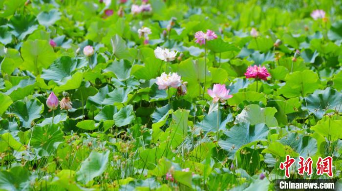 位于宁夏银川市兴庆区的鸣翠湖国家湿地公园荷花盛开。(图片来源:中新网)