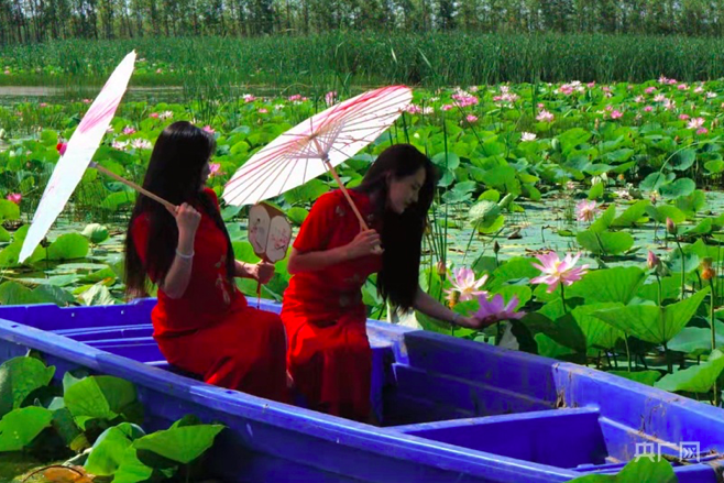 位于内蒙古自治区赤峰市翁牛特旗的百亩大漠荷塘,游人身着旗袍泛舟。(图片来源:北京央广网)