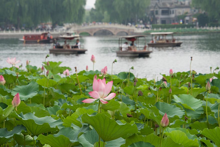 7月27日,北京什刹海公园荷花绽放,吸引游客乘船观赏。 (图片来源:中新社)