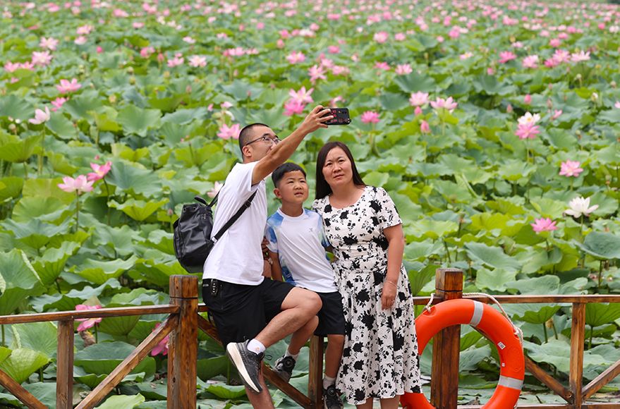 7月24日,河南省焦作市温县环城水系、公园的荷花竞相绽放,亭亭玉立,荷香四溢,吸引许多市民前来赏荷消夏。(图片来源:人民网)