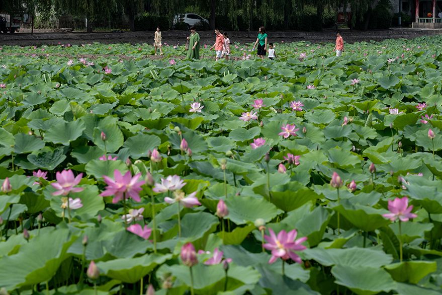 7月27日,山西省太原市晋源区北大寺村荷花苑,300余亩荷花竞相开放,吸引民众前来观赏。(图片来源:中新社)