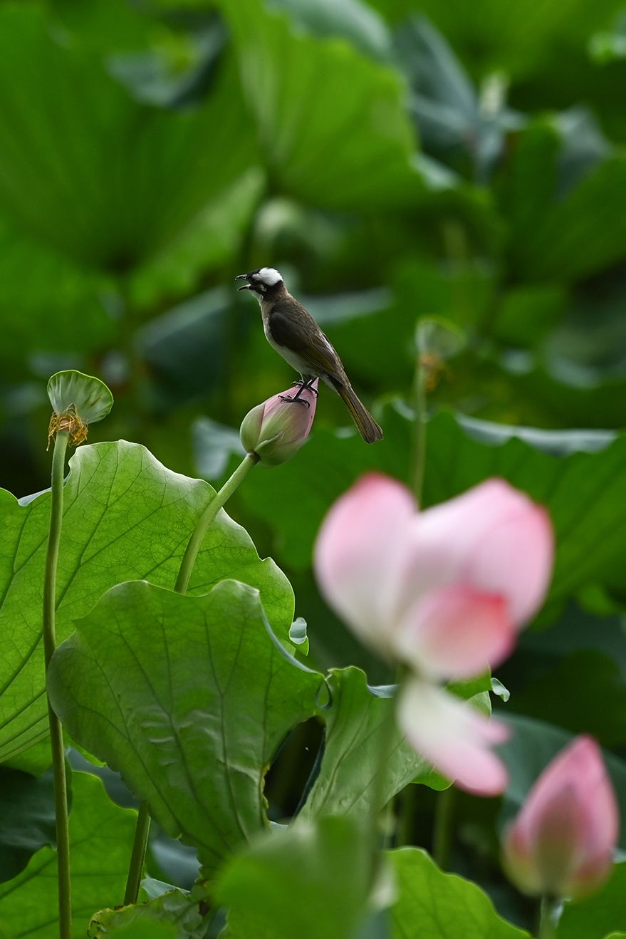 7月25日,一只白头鹎站立在西湖景区一朵待放的荷花上。时值盛夏,杭州西湖景区荷花竞相绽放,呈现出“接天莲叶无穷碧,映日荷花别样红”的美丽景象。(图片来源:新华社)