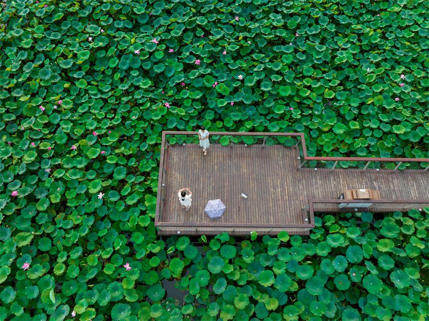 8月2日,宁夏银川,市民在鸣翠湖国家湿地公园的荷花栈道上打卡拍照。(图片来源:中新社)
