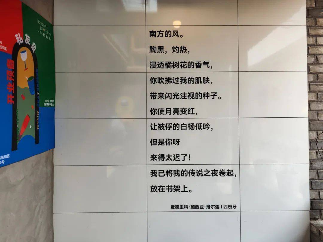 书店外的白底墙面上镶嵌着20世纪西班牙最伟大的诗人费德里科·加西亚·洛尔迦这样一首小诗:“但是你呀来得太迟了!我已将我的传说之夜卷起,放在书架上。”这更像是一种邀请。图为书店外的白色墙体。(图片来源:北京东城微信公众号)