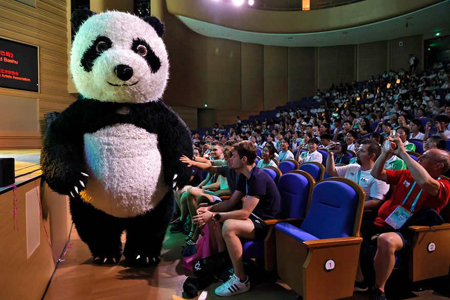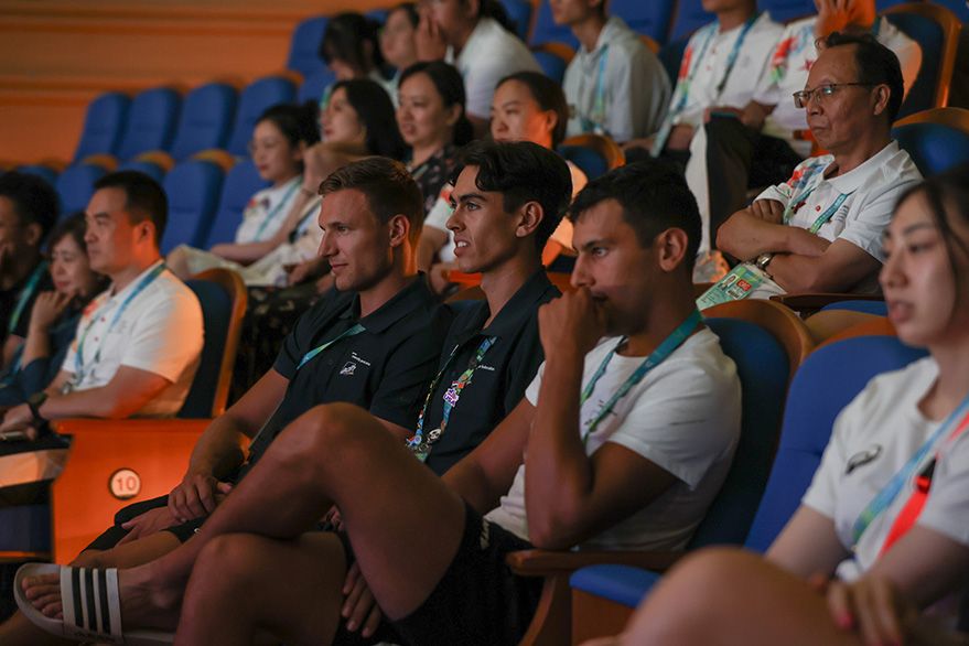 8月2日,四川成都,运动员在观看节目表演。(图片来源:中新社)