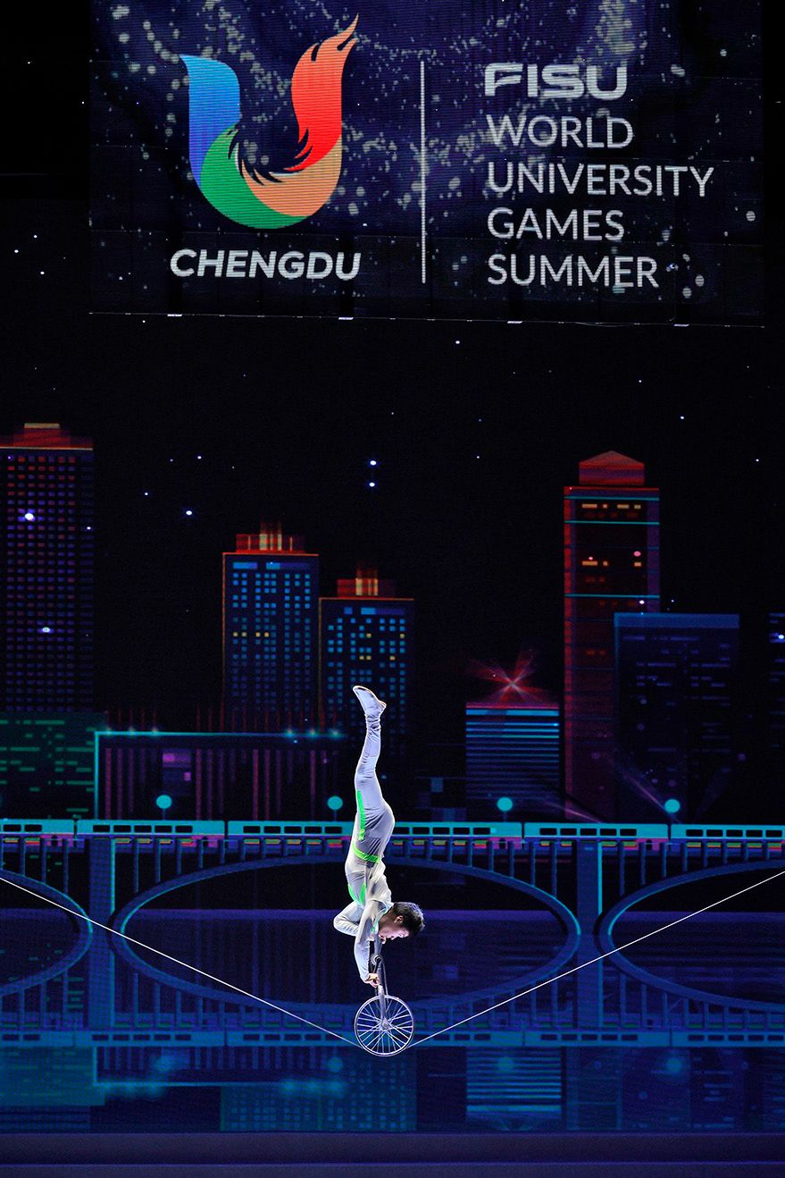 8月2日,来自成都市杂技艺术家协会的演员表演杂技《走钢丝》。