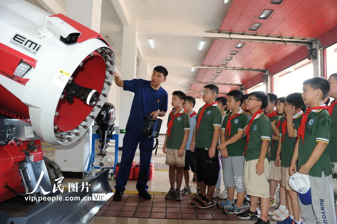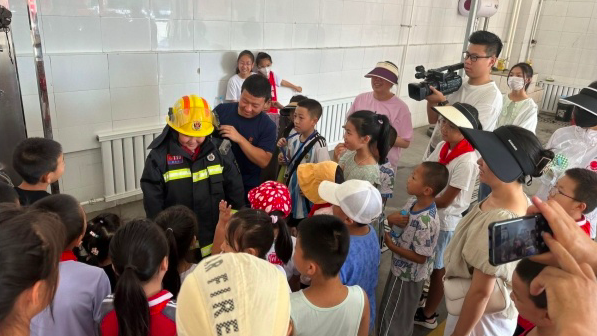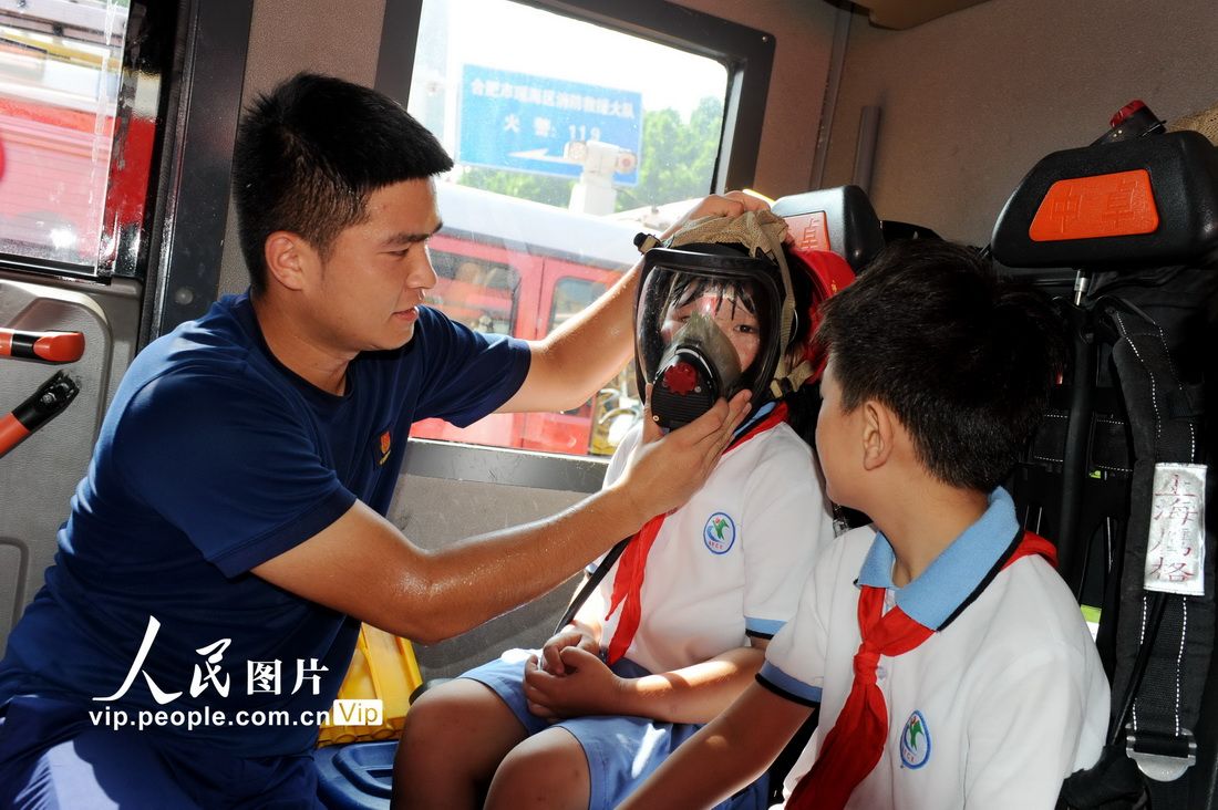 8月5日,在安徽省合肥市瑶海区消防救援大队花冲消防救援站,消防员正在为孩子们介绍消防应急装备。(图片来源:本文图片除标注外均自人民网)