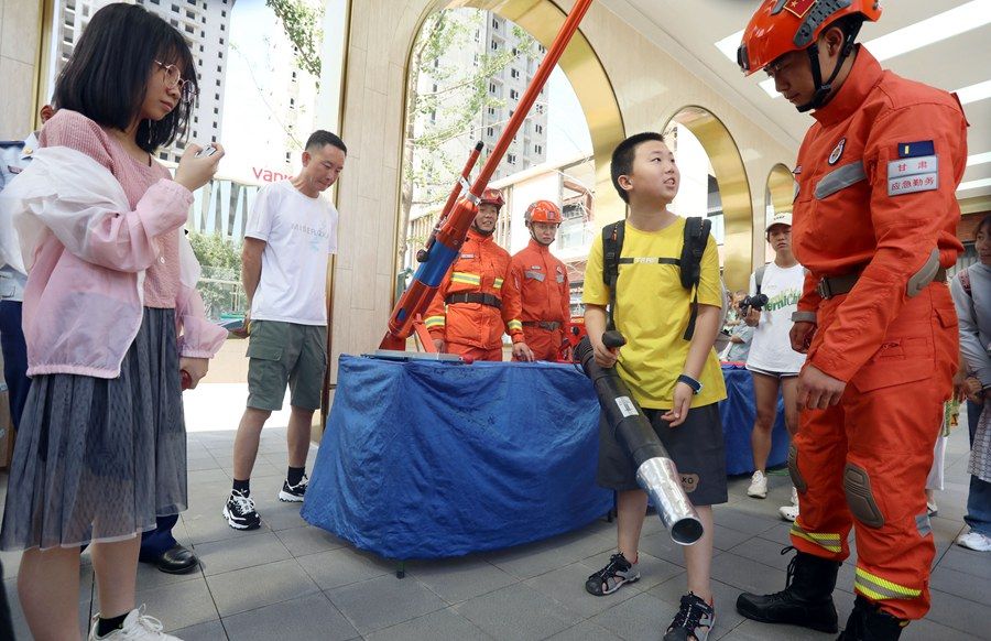 日前,甘肃省森林消防总队在兰州市西固区开展消防科普进社区活动,图为学生体验灭火救援装备。