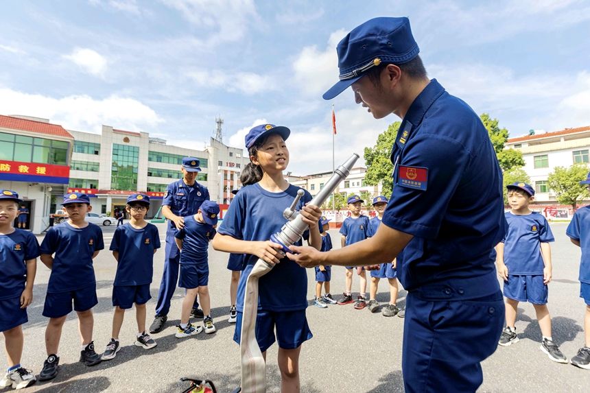 近日,江西省吉安市永新县举办“暑期消防夏令营”实践活动。图为小学生们亲身体验各类消防救援器材的使用方法。