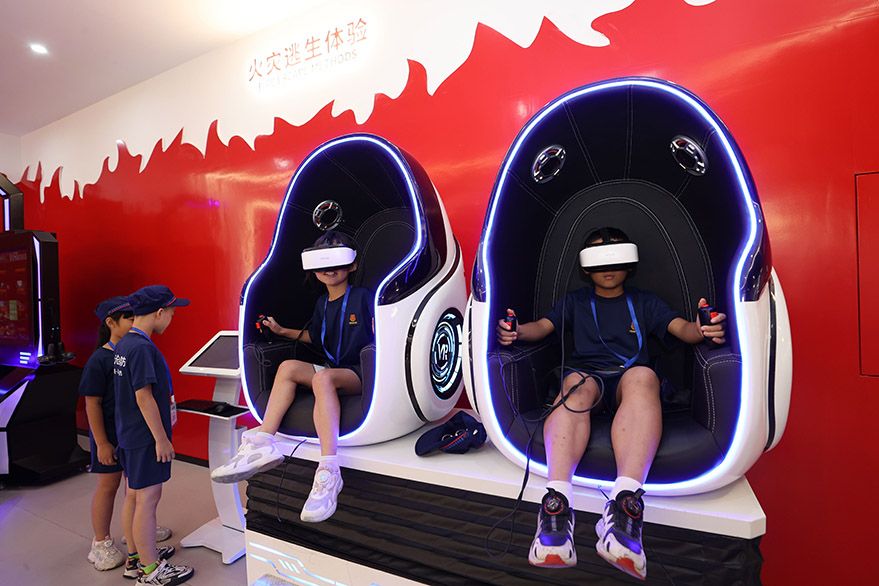 8月2日,在福建省厦门市消防科技教育馆,小学生通过消防VR设备体验火灾逃生。(图片来源:新华社)