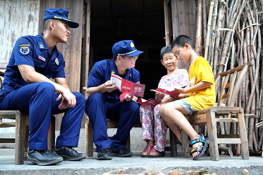 7月24日,湖南常德市桃源县沙坪镇万寿宫街的一农户家中,消防员向留守老人、留守儿童宣讲家庭防火、用火知识。(图片来源:中新社)