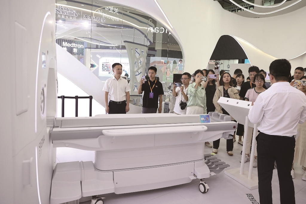 资料图为参展商介绍GE医疗7.0T磁共振系统。(图片来源:中新社)