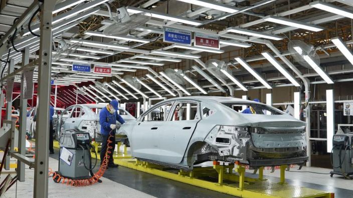 图为在位于江西省南昌市经开区的江铃集团新能源汽车有限公司生产基地车间内,工人在生产线上作业。(图片来源:新华社)