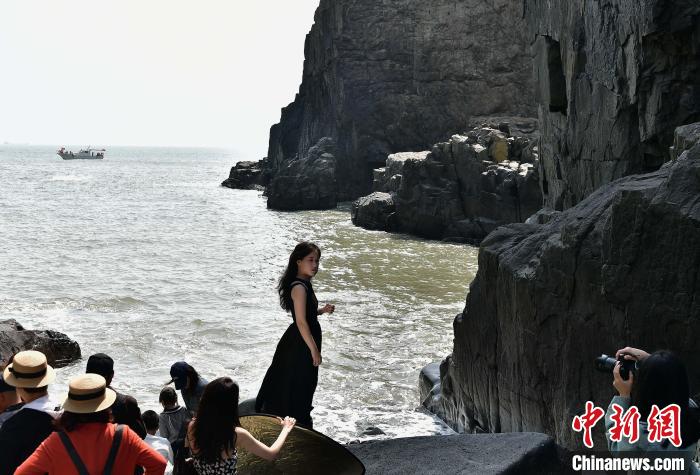 游人在平潭仙人井景区拍照留念。福建平潭国际旅游岛独具特色的“风、海、石、厝”,吸引了许多游客前去观光度假。