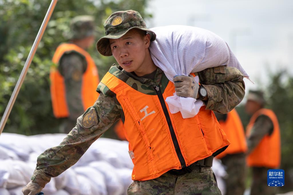 8月8日,在哈尔滨市双城区万隆乡增产村抗洪现场,陆军第78集团军某旅官兵在运送筑坝沙袋。(图片来源:新华网)