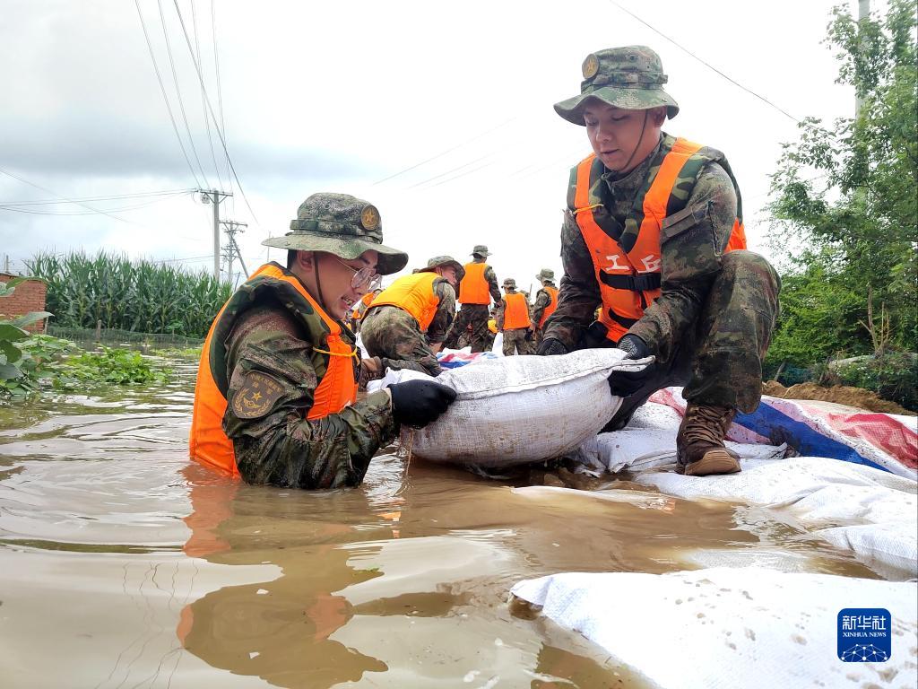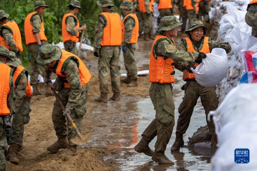 8月8日正午时分,在黑龙江省哈尔滨市双城区万隆乡增产村,来自陆军第78集团军某旅的800余名官兵奋战在抗洪一线。图为陆军第78集团军某旅官兵在构筑堤坝。(图片来源:新华网)