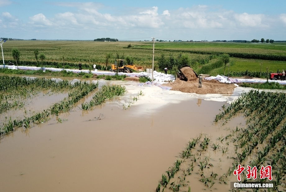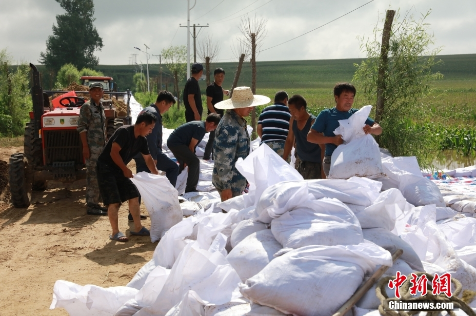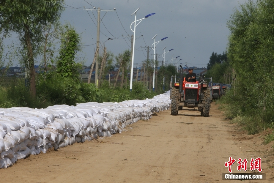 8月9日,黑龙江省哈尔滨市双城区万隆乡增产村多口店屯,村民志愿者运送沙土加固沙堤。(图片来源:中新网)