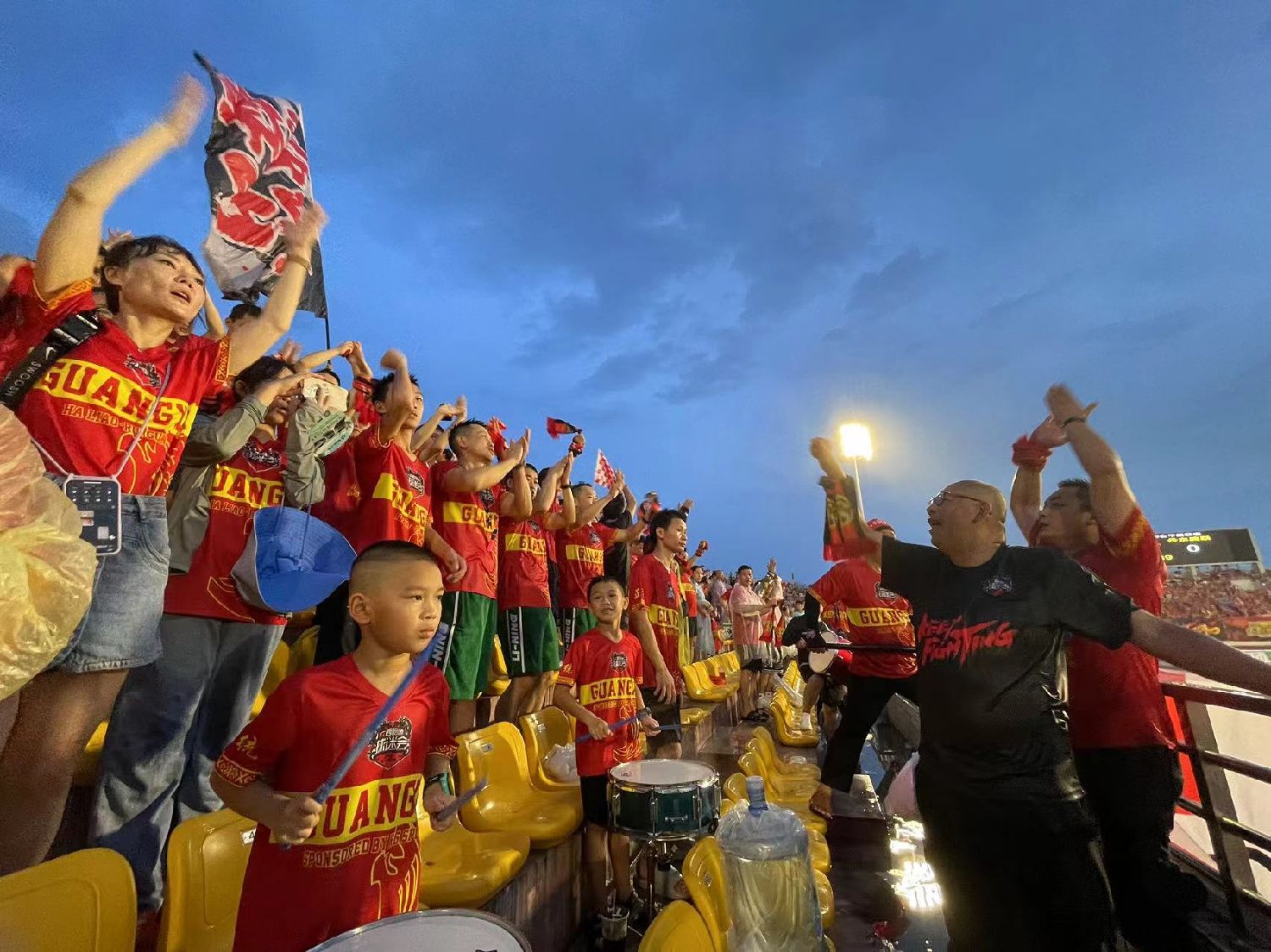 “战斗!广西队!”北京时间8月12日晚,广西平果体育场,欢呼声响彻夜空,看台上座无虚席,身着红色球服的球迷将体育场染成了一片红色的海洋,人们铆足了劲唱山歌、玩人浪、摇旗击鼓、呐喊助威。