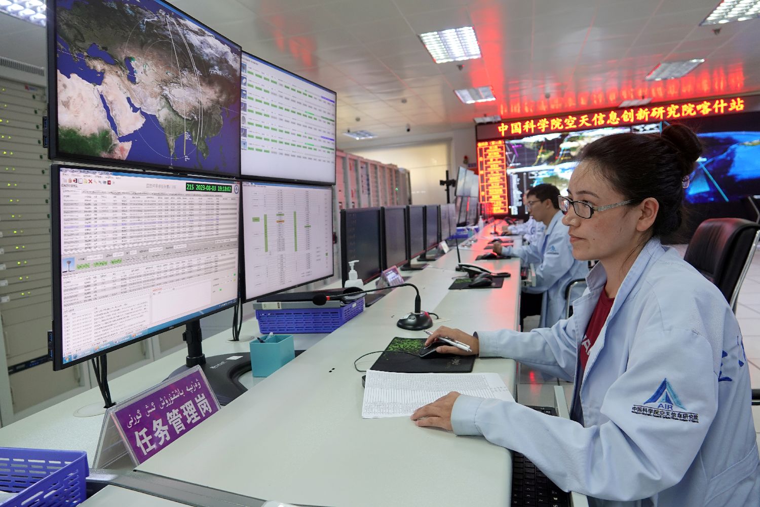 8月上旬,中国科学院空天院喀什站,科研人员在卫星数据接收机房工作。中新社记者 孙自法 摄