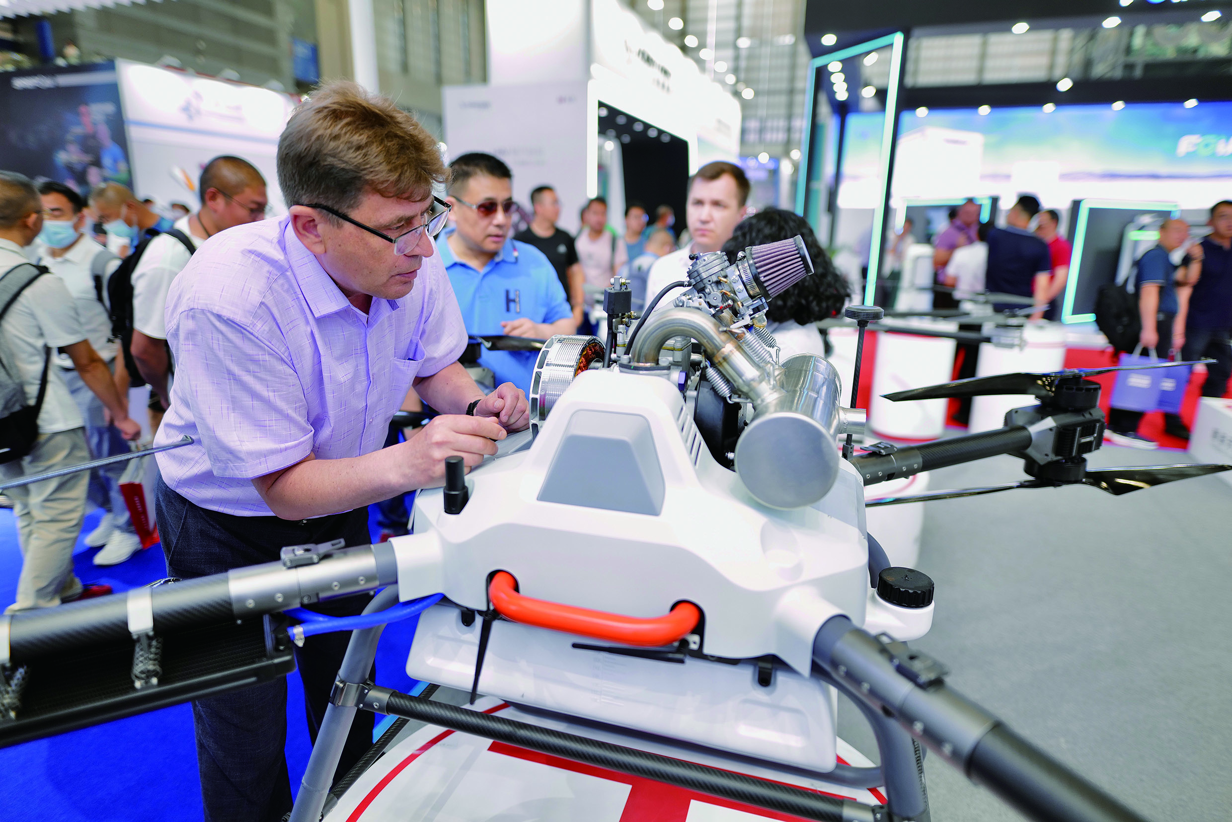 6月2日,2023第七届世界无人机大会暨第八届深圳国际无人机展览会在广东深圳会展中心举行,海内外300多家企业携带3000多架(台)无人机系统装备新产品展示。图为外商关注参展商广州华科尔QL2000油电混合无人机。(图片来源:中新社)