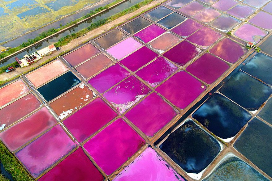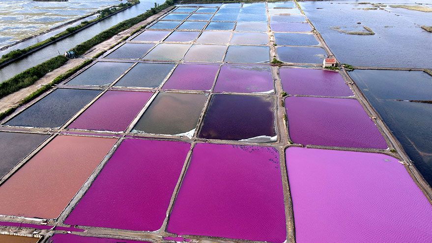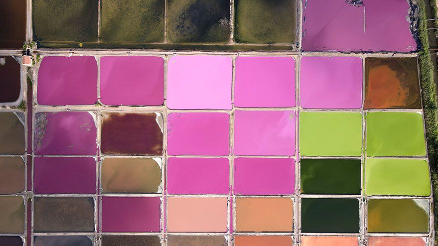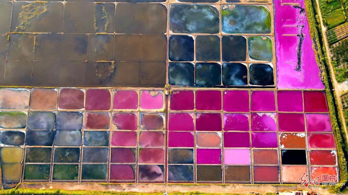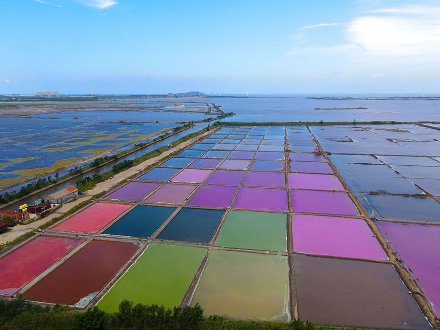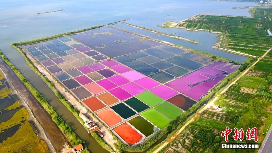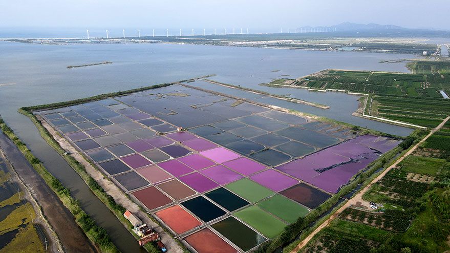8月7日,俯瞰山东省荣成市港西镇大海边的多彩盐田,五彩缤纷。(图片来源:中新网)