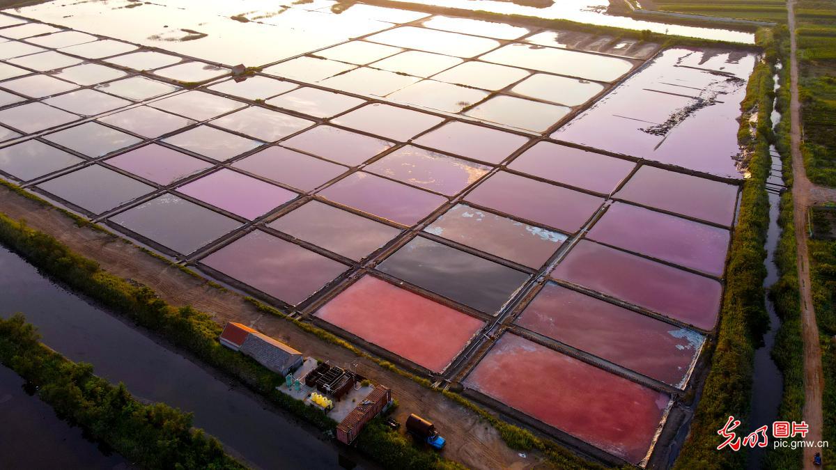 2023年8月16日,山东省荣成市港西镇沿海的一处古老的盐田呈现出尽染粉黛,宛如大自然的调色盘。(图片来源:光明网)