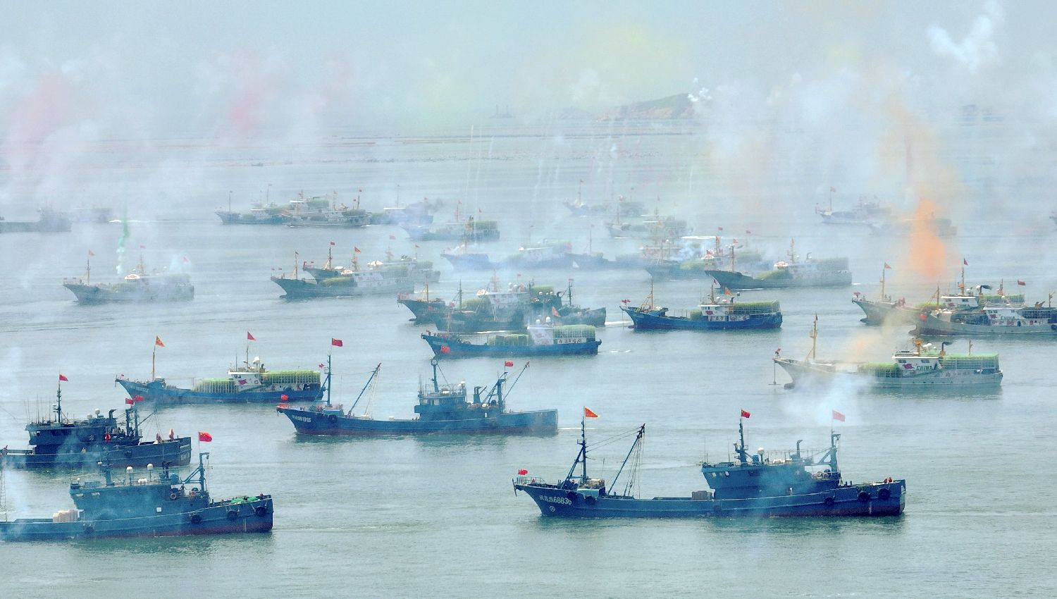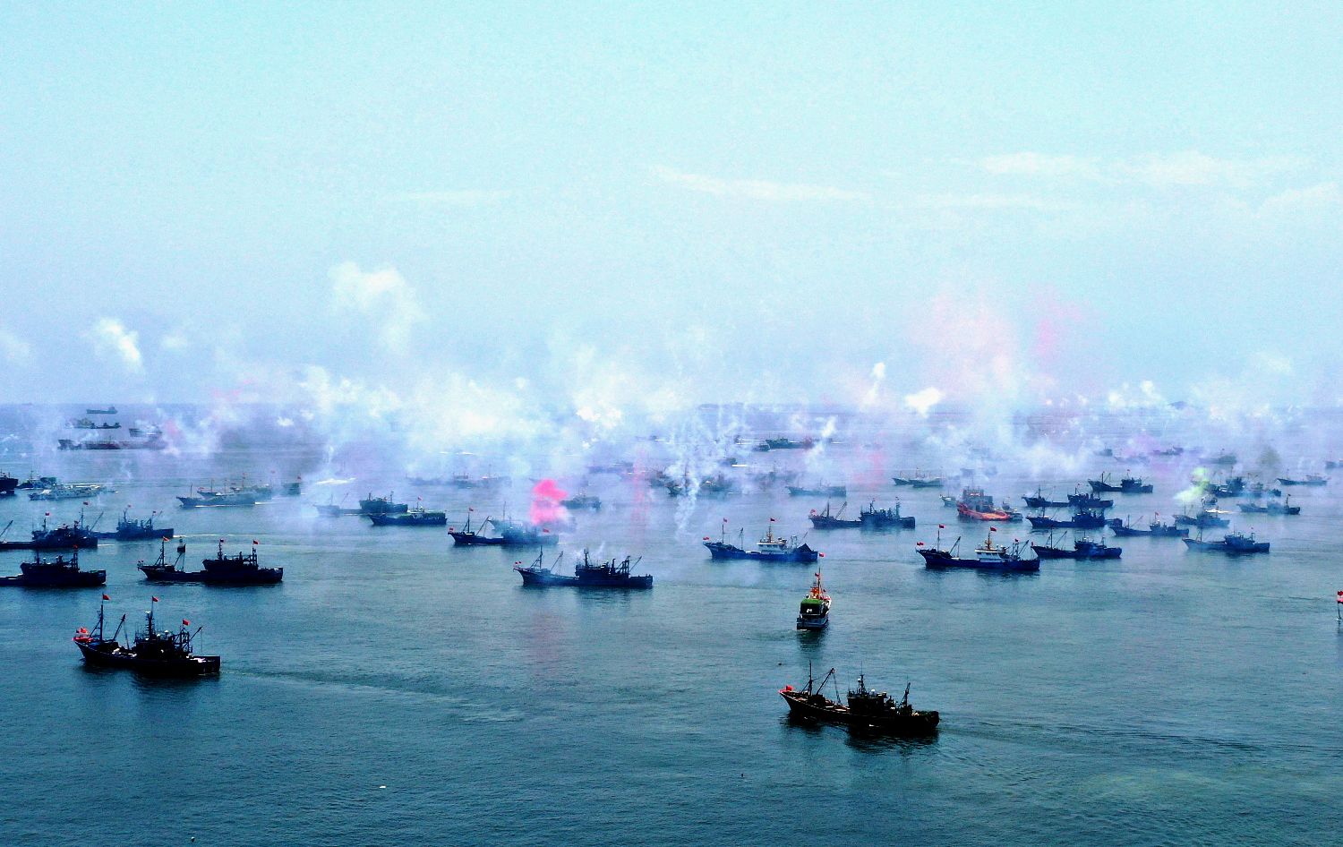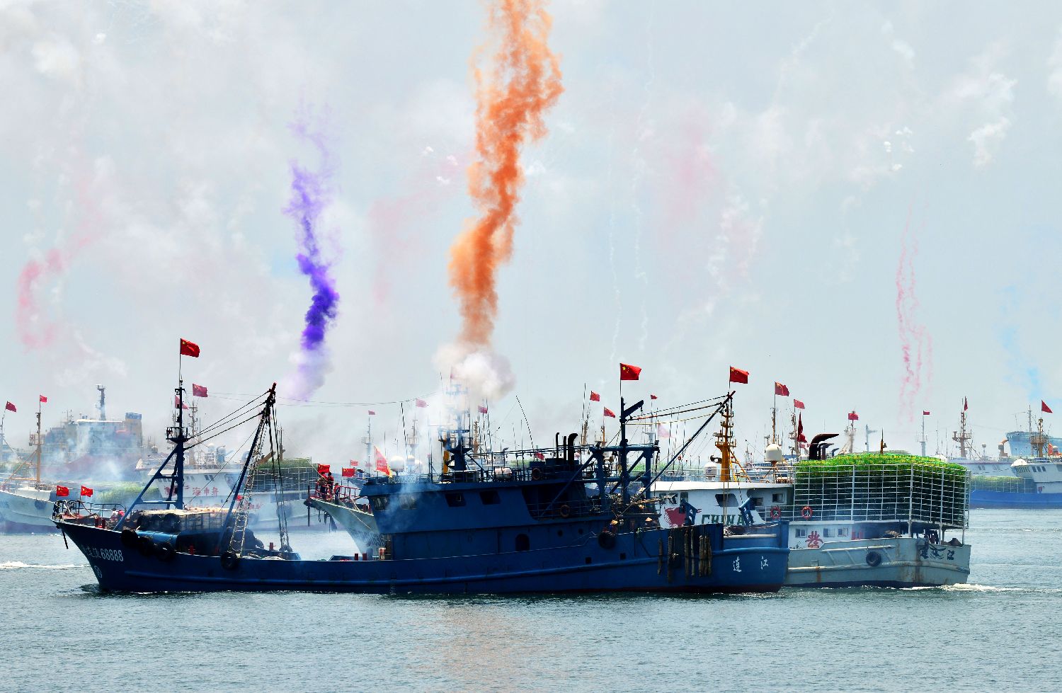 黄岐国家中心渔港渔船汽笛长鸣、彩烟齐放。(图片来源:中新社)