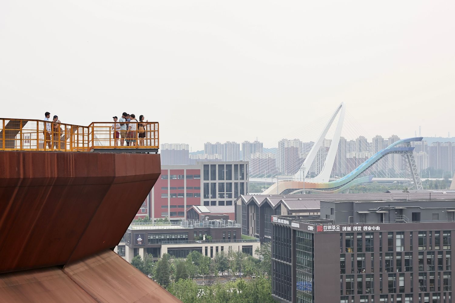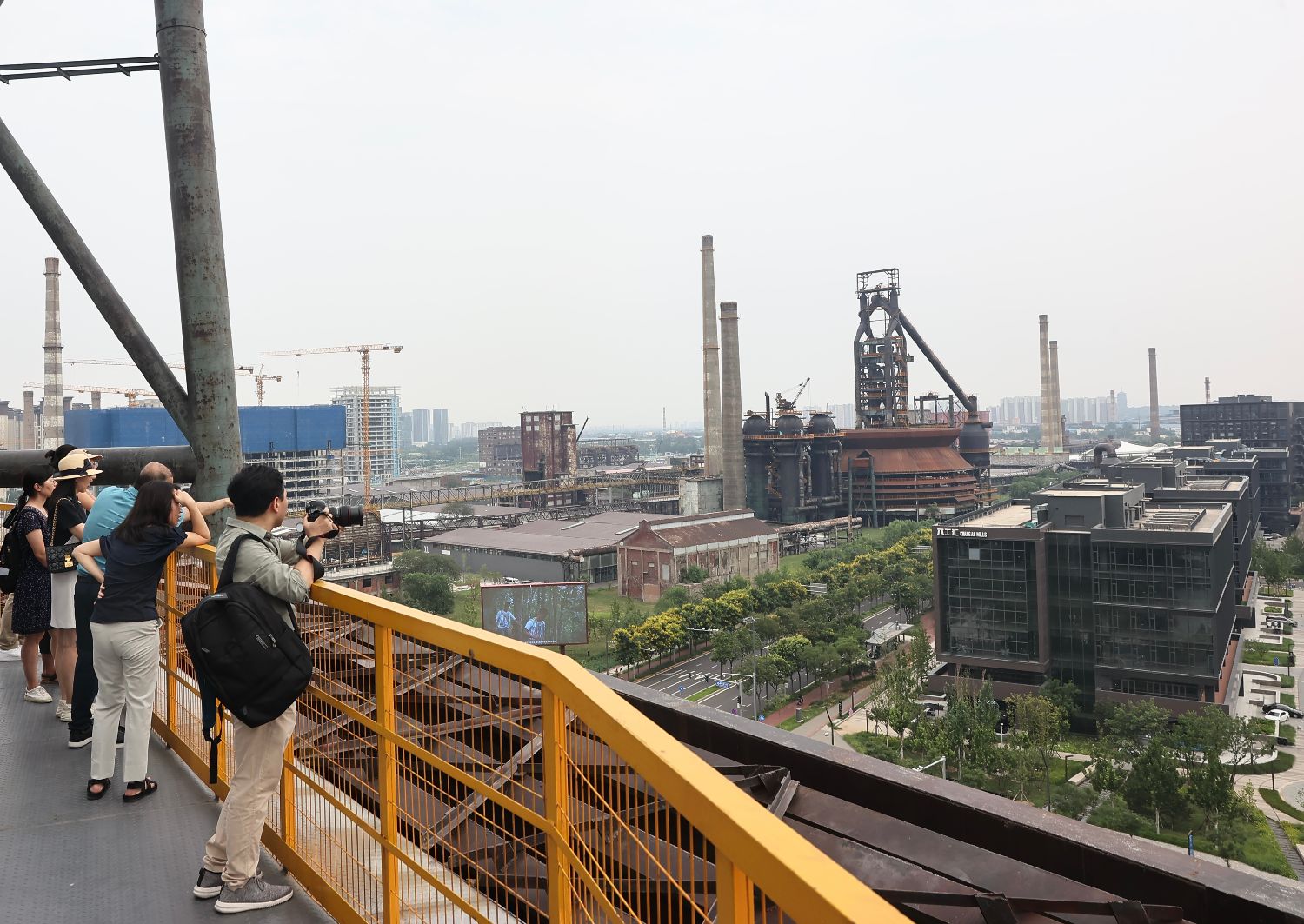 8月17日,民众在首钢园三高炉观景台上观赏风景。(图片来源:中新社)