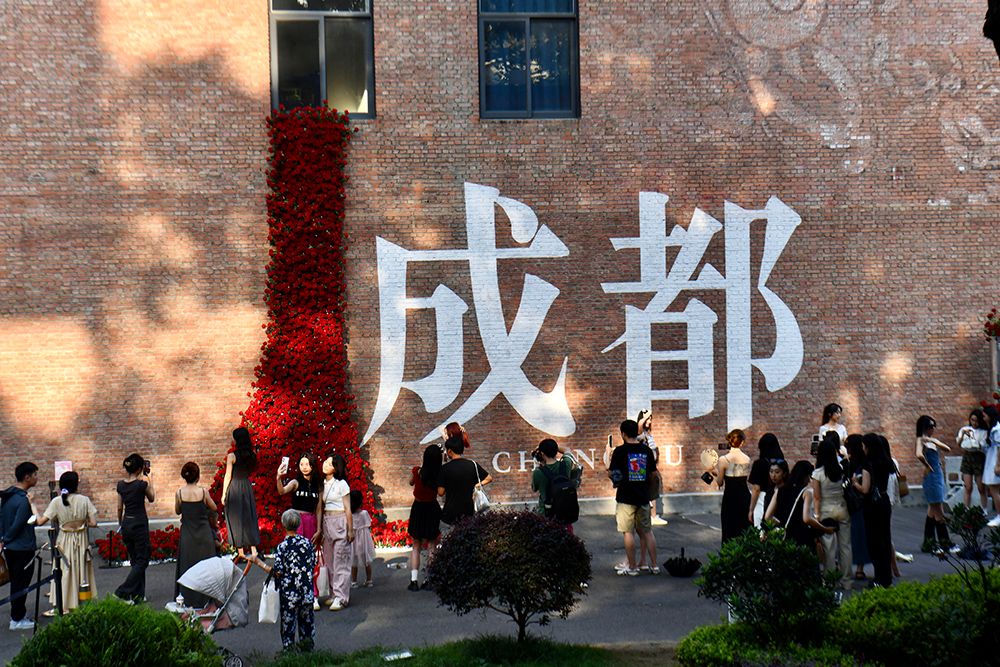 四川成都东郊记忆一处玫瑰花瀑布景观吸引民众打卡拍摄。该景观由5200余朵玫瑰组成,为七夕增添一丝浪漫。 (图片来源:中新社)