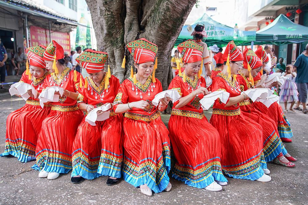 中国农历七月初六,广西南宁市邕宁区蒲庙镇孟连村那莲街上演一年一度的非遗民俗活动“赛巧节”,当地民众通过祈福、“赛巧”等民俗活动迎接即将到来的七夕。图为当地妇女进行刺绣比赛。(图片来源:中新社)