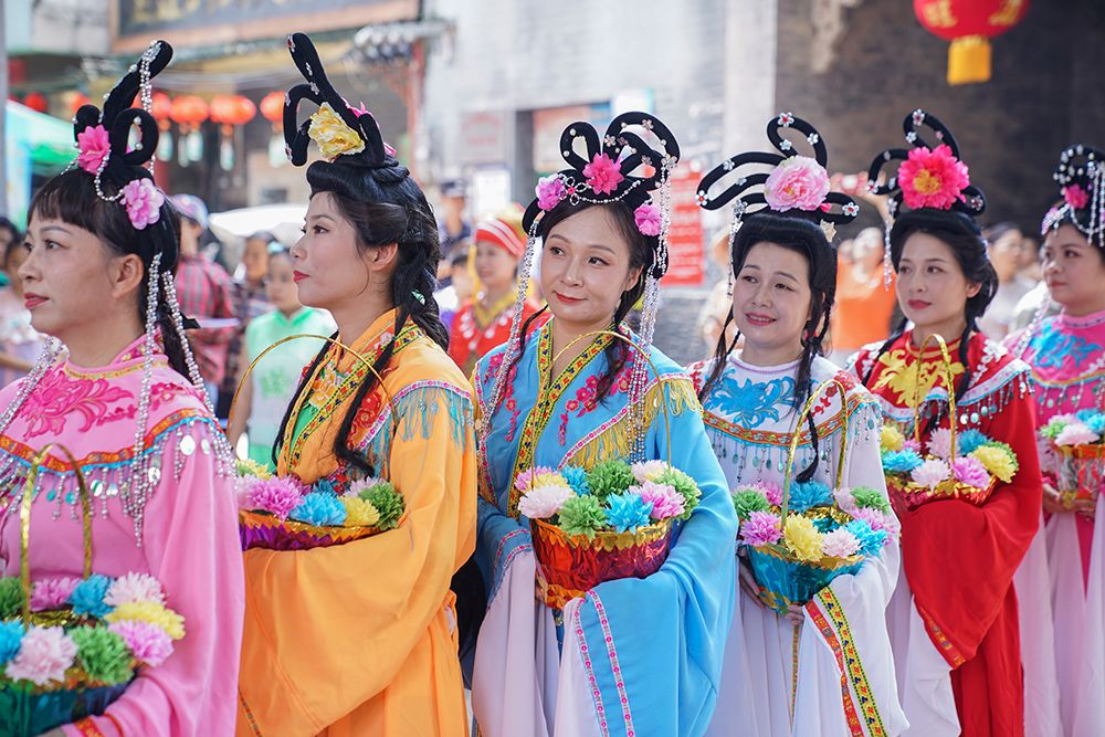 广西南宁那莲街“赛巧”迎七夕。图为“七仙女”进行祈福。(图片来源:中新社)