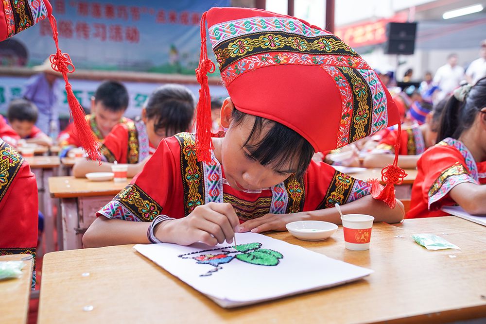 小学生进行非遗项目“点米成画”比赛。(图片来源:中新社)