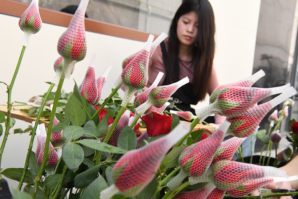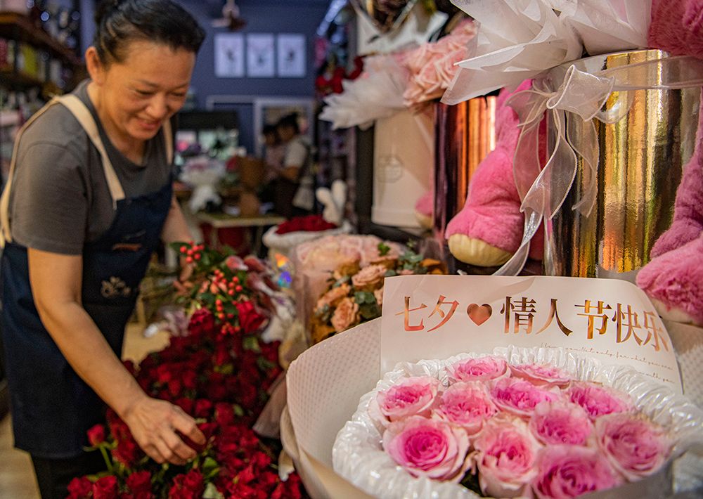 “七夕”前夕,鲜花市场呈现俏销势头,不少商家精心准备花卉产品,吸引顾客前来购买。(图片来源:新华社)