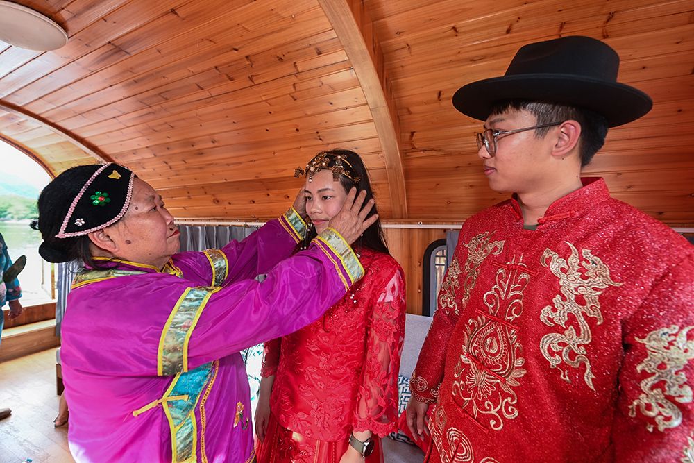 青年情侣在三都镇三都渔村体验水上婚礼。(图片来源:新华社)