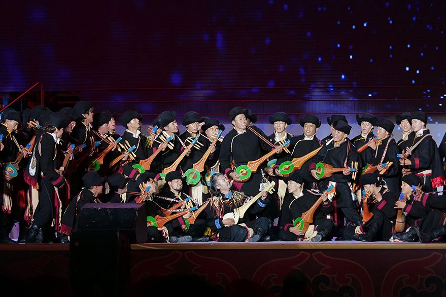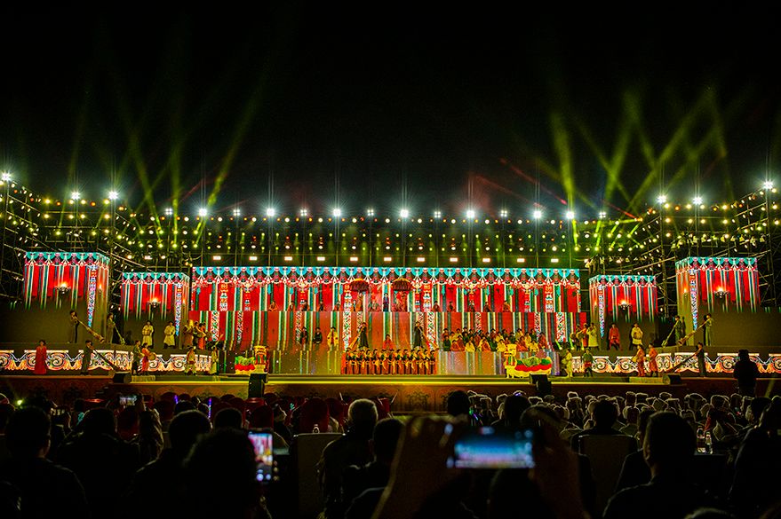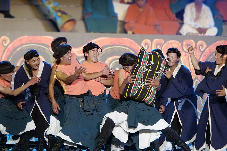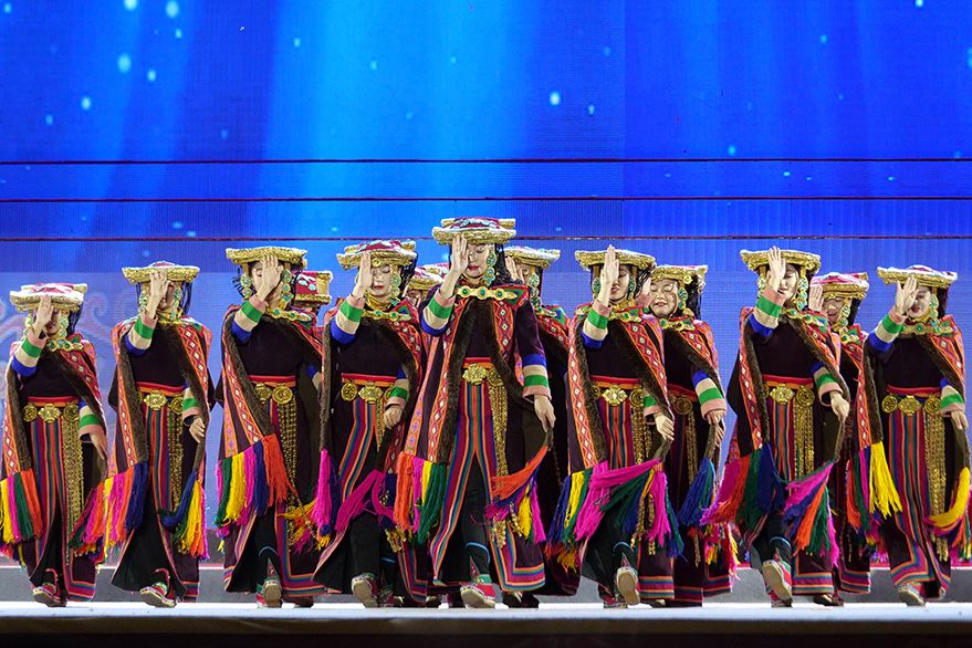 开幕式上,精彩绝伦的大型民族舞蹈文艺演出为各地来宾呈现了一场文化与视觉盛宴。演出共分为《悠远古韵》《诗意微芒》《如炬经典》《辉煌盛世》四个篇章,展现出全阿里民众的精神面貌和独特的阿里神韵。