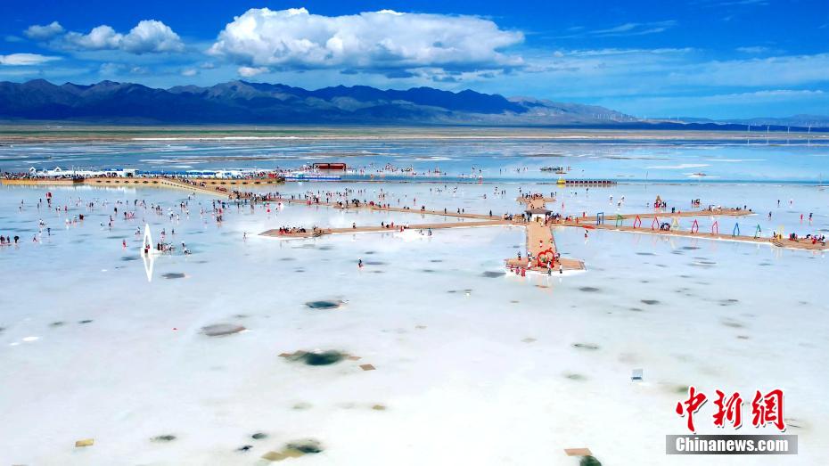 秋高气爽,在位于柴达木盆地的青海省海西蒙古族藏族自治州乌兰县,茶卡盐湖展现水映天,天接地,人在湖中走,宛如画中游的独特美景。图为游客在茶卡盐湖游览。(图片来源:本文图片除标注外均综编自中新网)