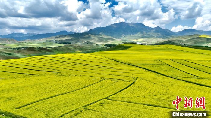 8月,位于青海省东部的海东市化隆县,一处海拔约3000米的油菜种植基地内,大片油菜花盛开,宛如金黄色地毯,铺陈在高原。